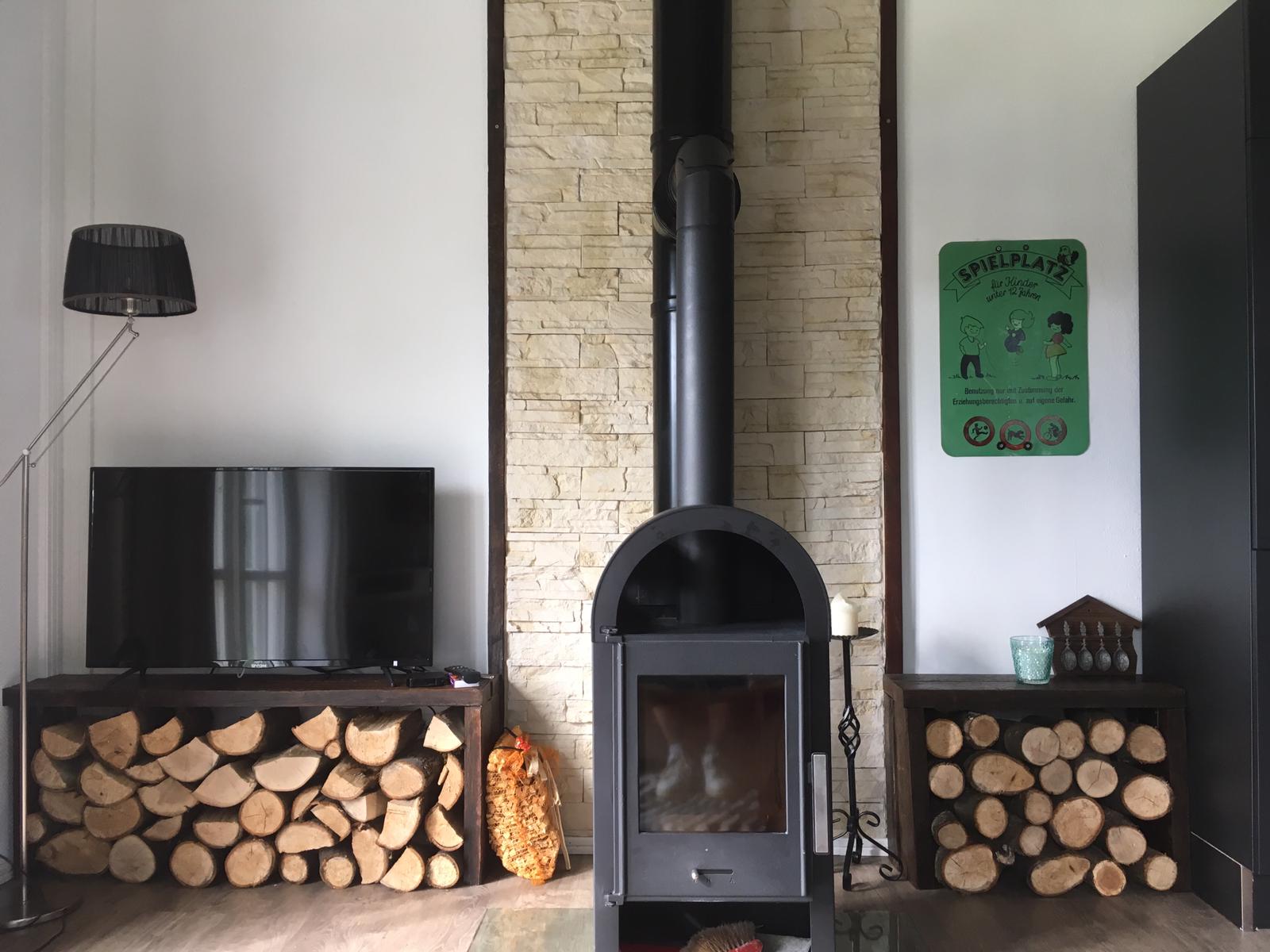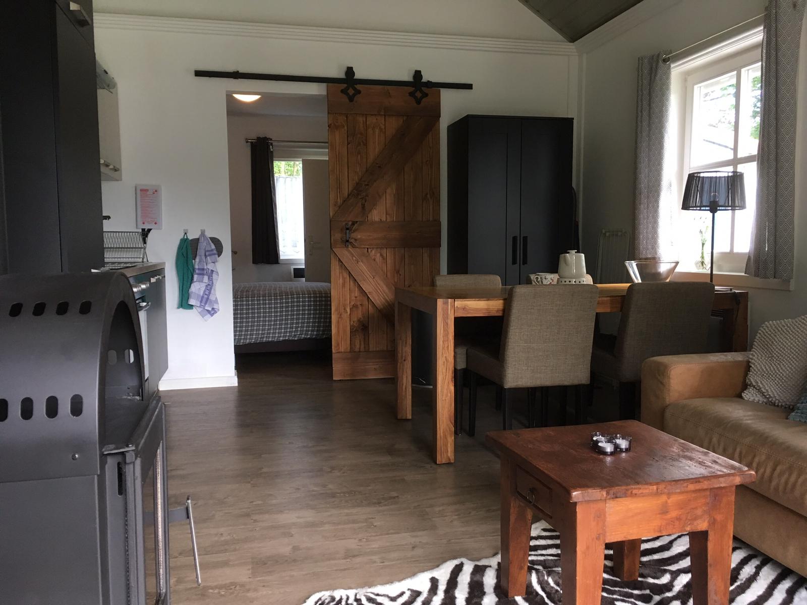 Je komt binnen in de warme leefruimte met een houtkachel. Rond de houtkachel staat een heerlijke bank.