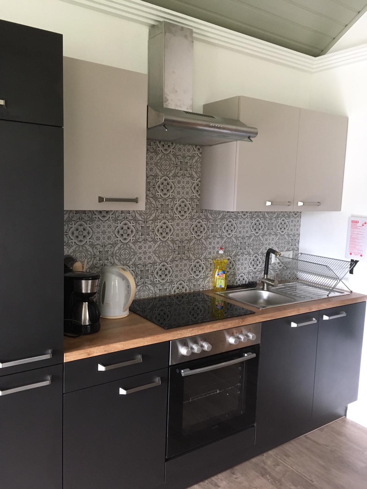 De keuken is van alle gemakken voorzien is (oven, keukengerei, koelkast, koffiezetapparaat). Naast de keuken is een zithoek te vinden, ideaal om aan te eten met een haardvuur op de achtergrond. Tevens is er een terras in de flinke tuin waar van de mooie omgeving genoten kan worden.