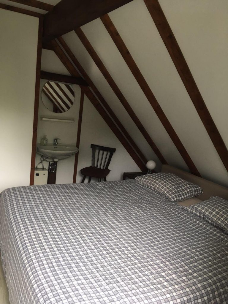Via de eerste verdieping loop je via de donkere houten trap naar de tweede verdieping. Hier zijn nog twee slaapkamers te vinden. In de eerste slaapkamer vind je nog een tweepersoonsbed (boxspring). De andere slaapkamer heeft twee losse eenpersoonsbedden. In beide slaapkamers bevind zich een eigen wastafel met warm en koud water. Tevens bieden deze twee slaapkamers toegang tot het ruime balkon. Vanaf dit balkon heb je ver uitzicht over het bos en het park. Tot s’avonds laat is hier de zon te vinden en je kijkt uit op een panorama uitzicht. Het balkon dient zich dan ook goed om een boekje te lezen of een wijntje te drinken in de namiddag.